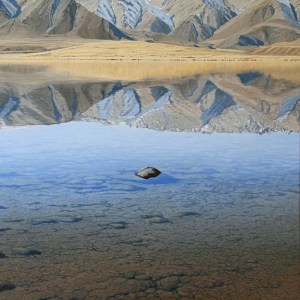 Walking along the shores of Lake Heron on a perfectly calm winter morning, I saw this rounded boulder sitting proud of the shallow water. Usually, the lakes surface is rippled to some degree, reducing the definition of any reflections but on this occasion, I was presented with virtually a mirror image of the mountains.