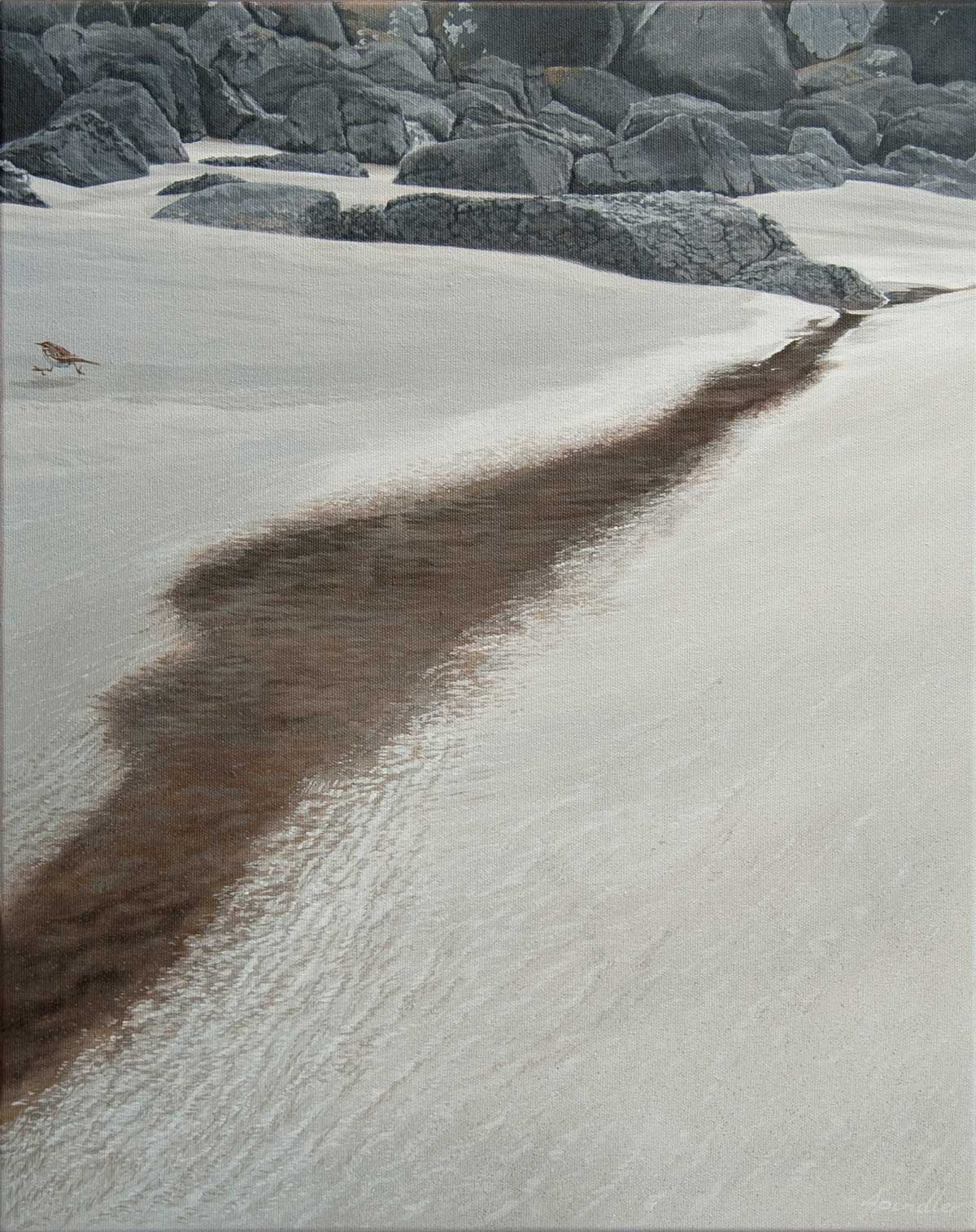 This channel of water left as the tide receded, provided a strong diagonal which leads the eye into the painting. A Pipit scurried around as I made studies, so I decided to include one as a compositional aid and a touch of humour.