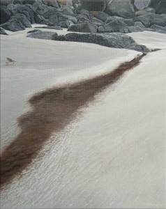 An overcast day, gave the volcanic sand and rocks at Tumbledown Bay an almost monochromatic appearance. The painting was in fact completed using only four colours.